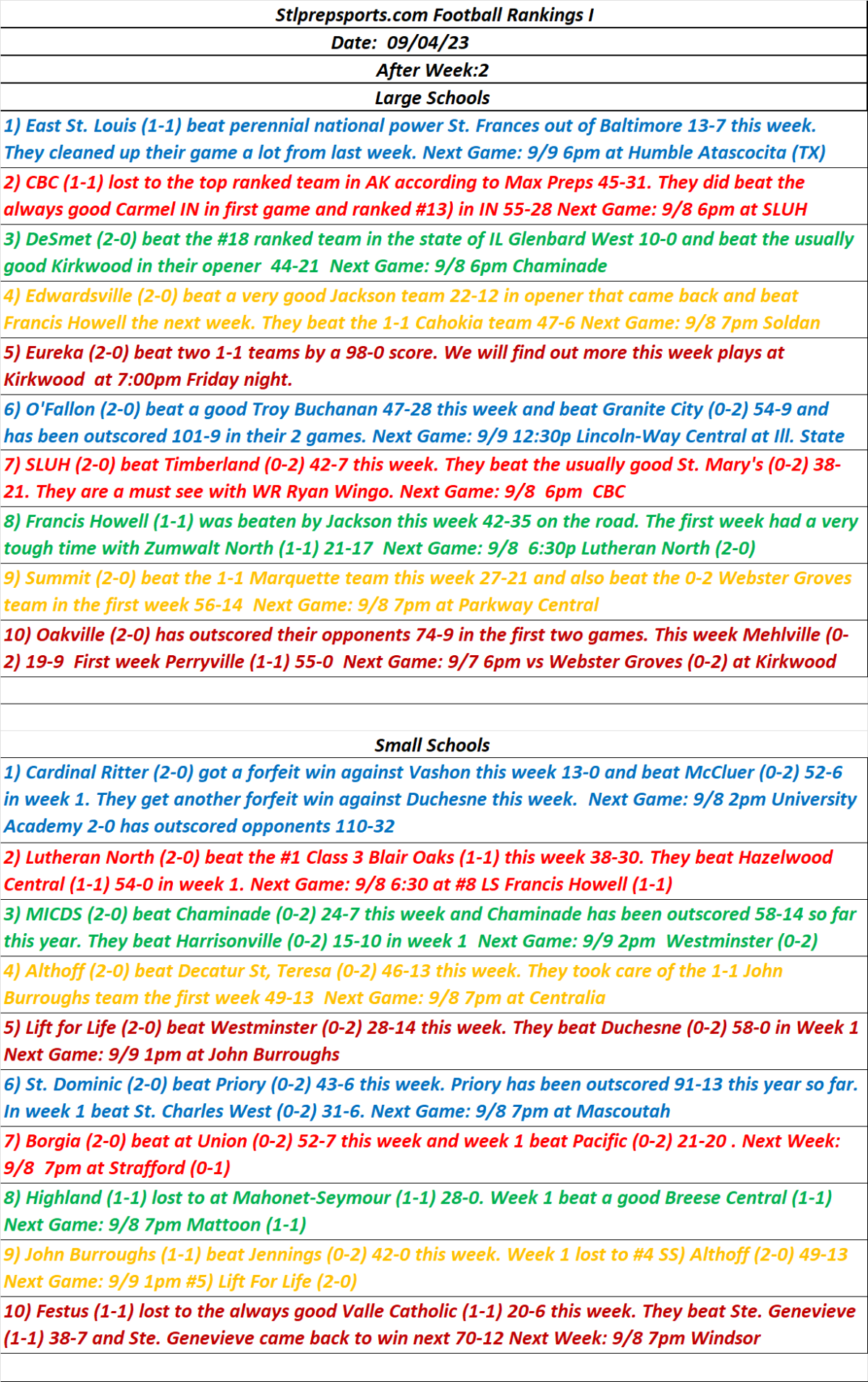 Stlprepsports.com 2023 St. Louis Metro Area High School Football Rankings I 09/07/23 Share this: Click to share on X (Opens in new window) X Click to share on Facebook (Opens in new window) Facebook Like Loading...