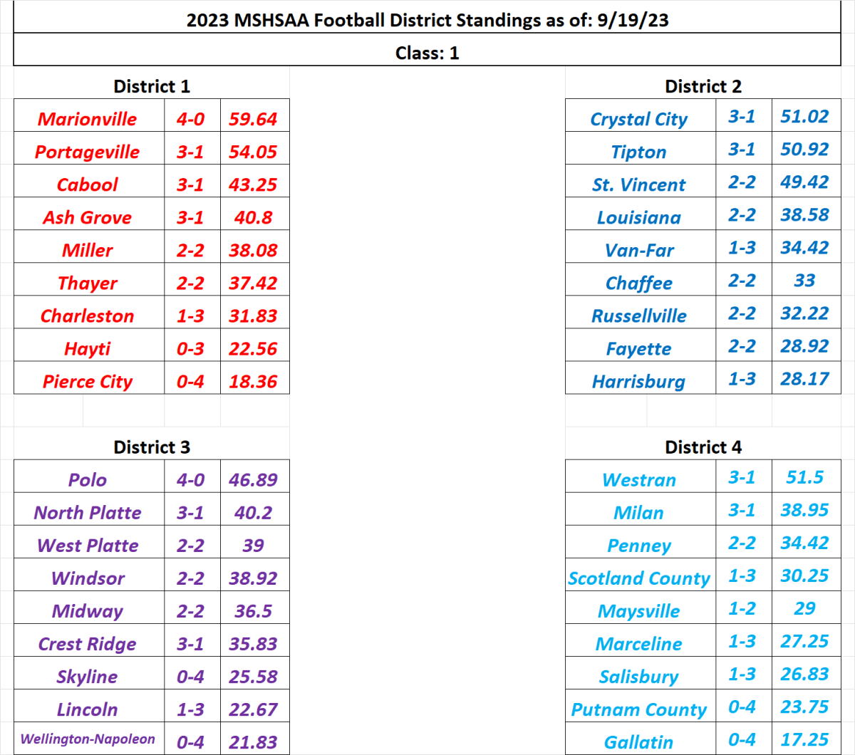 Stlprepsports.com 2023 MSHSAA Class 1 Football District Standings as of 9/19/23 Share this: Click to share on X (Opens in new window) X Click to share on Facebook (Opens in new window) Facebook Like Loading...