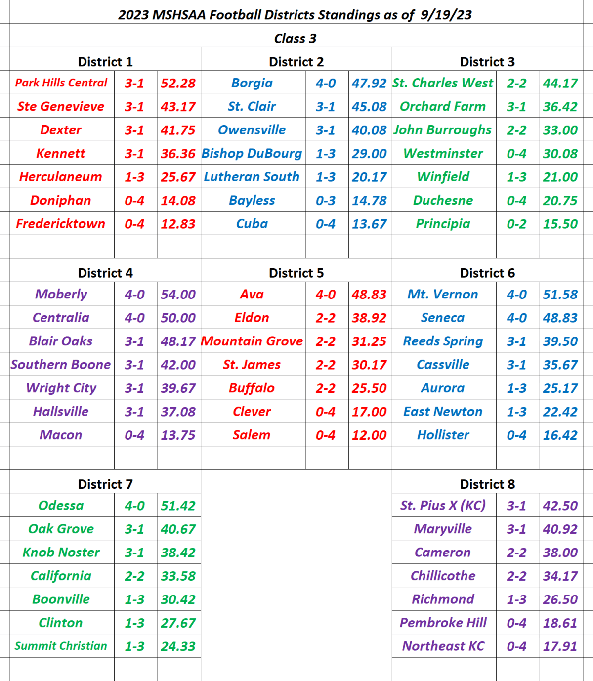 Stlprepsports.com 2023 MSHSAA Class 3 Football District Standings as of 9/19/23 Share this: Click to share on X (Opens in new window) X Click to share on Facebook (Opens in new window) Facebook Like Loading...