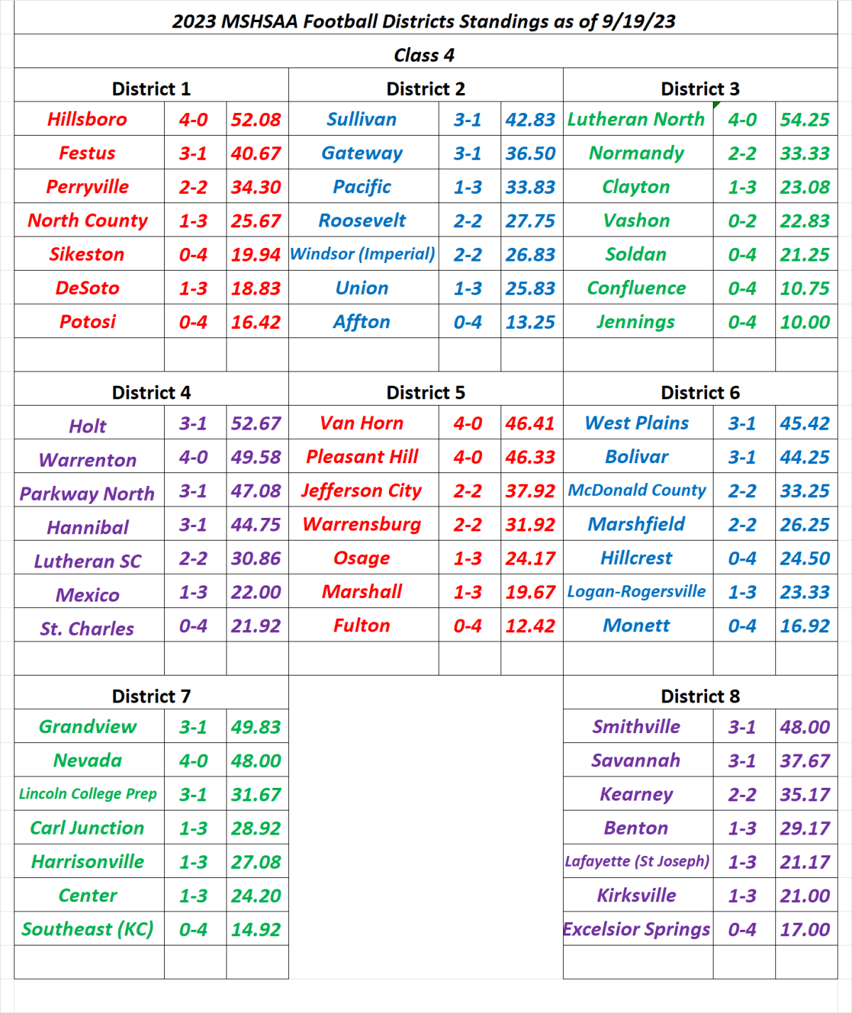 Stlprepsports.com 2023 MSHSAA Class 4 Football District Standings as of 9/19/23 Share this: Click to share on X (Opens in new window) X Click to share on Facebook (Opens in new window) Facebook Like Loading...
