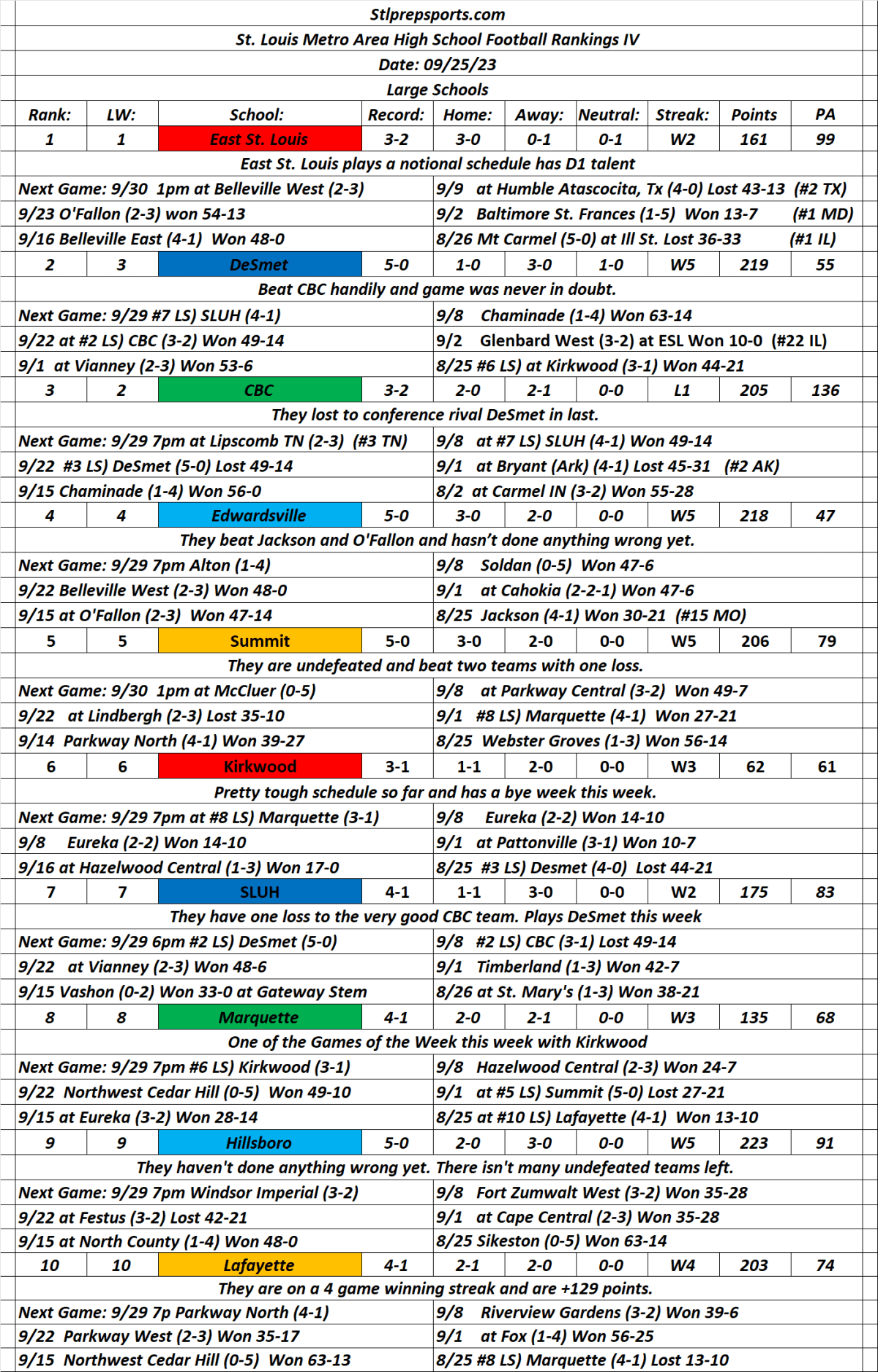 Stlprepsports.com 2023 St. Louis Metro Area High School Football Rankings Large Schools IV 09/25/23 Share this: Click to share on X (Opens in new window) X Click to share on Facebook (Opens in new window) Facebook Like Loading...