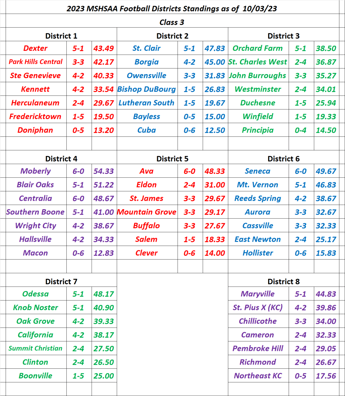 Stlprepsports.com 2023 MSHSAA Class 3 Football District Standings as of 10/03/23 Share this: Click to share on X (Opens in new window) X Click to share on Facebook (Opens in new window) Facebook Like Loading...
