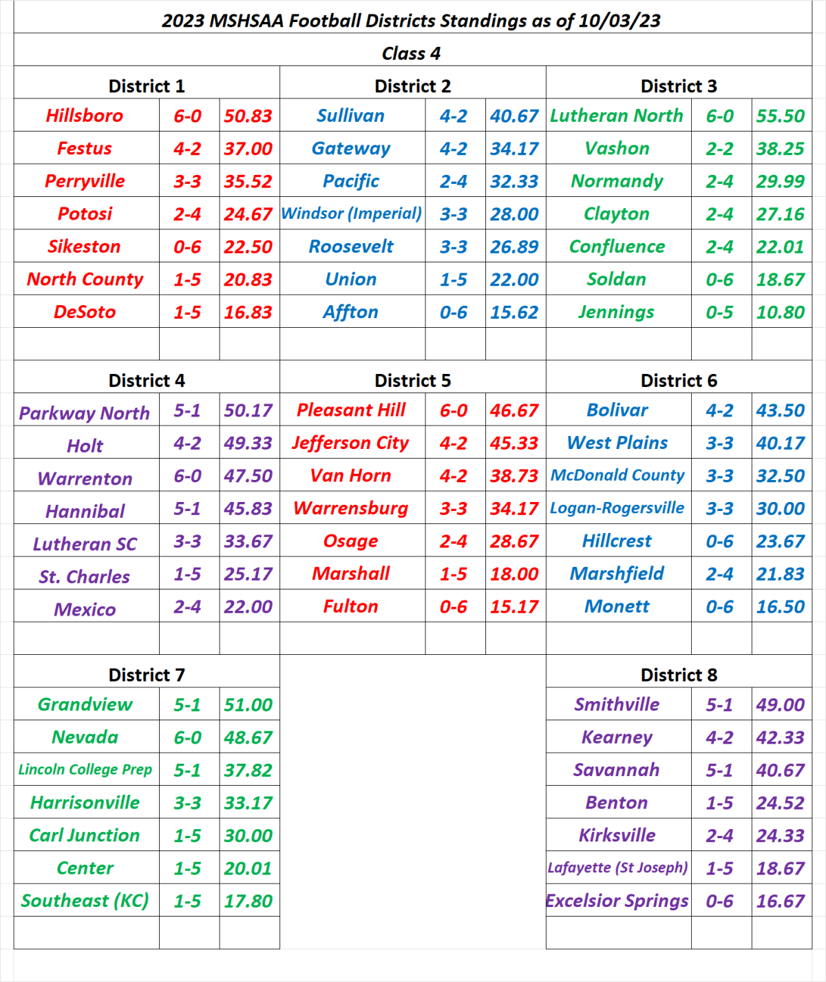 Stlprepsports.com 2023 MSHSAA Class 4 Football District Standings as of 10/03/23 Share this: Click to share on X (Opens in new window) X Click to share on Facebook (Opens in new window) Facebook Like Loading...