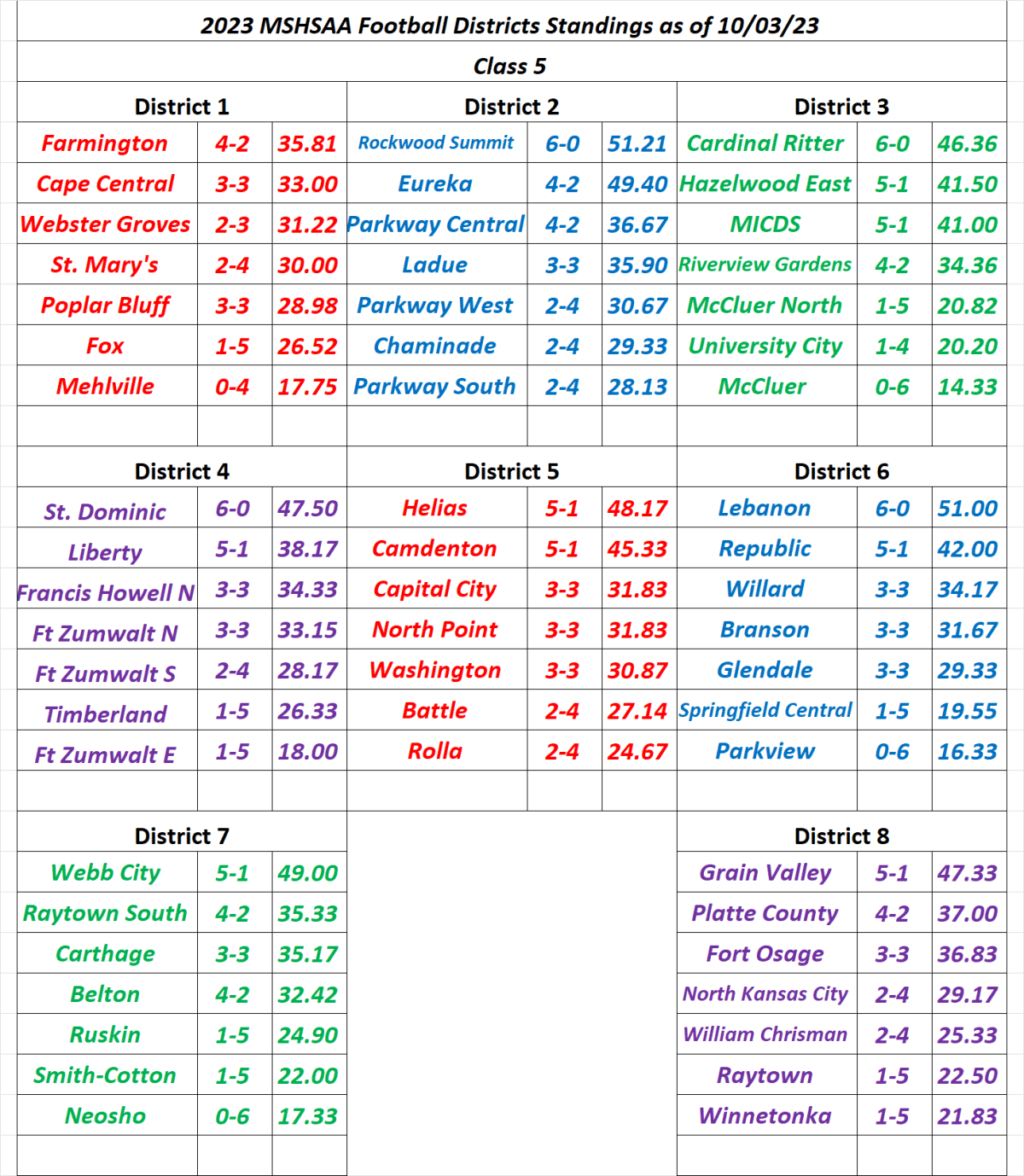 Stlprepsports.com 2023 MSHSAA Class 5 Football District Standings as of 10/03/23 Share this: Click to share on X (Opens in new window) X Click to share on Facebook (Opens in new window) Facebook Like Loading...