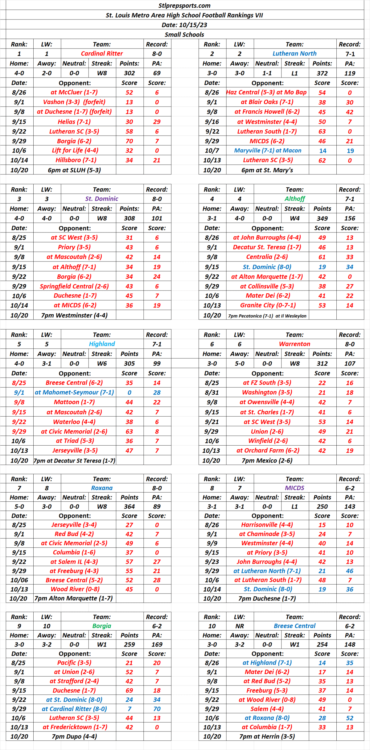 Stlprepsports.com 2023 St. Louis Metro Area High School Football Rankings Small Schools VII 10/15/23 Share this: Click to share on X (Opens in new window) X Click to share on Facebook (Opens in new window) Facebook Like Loading...