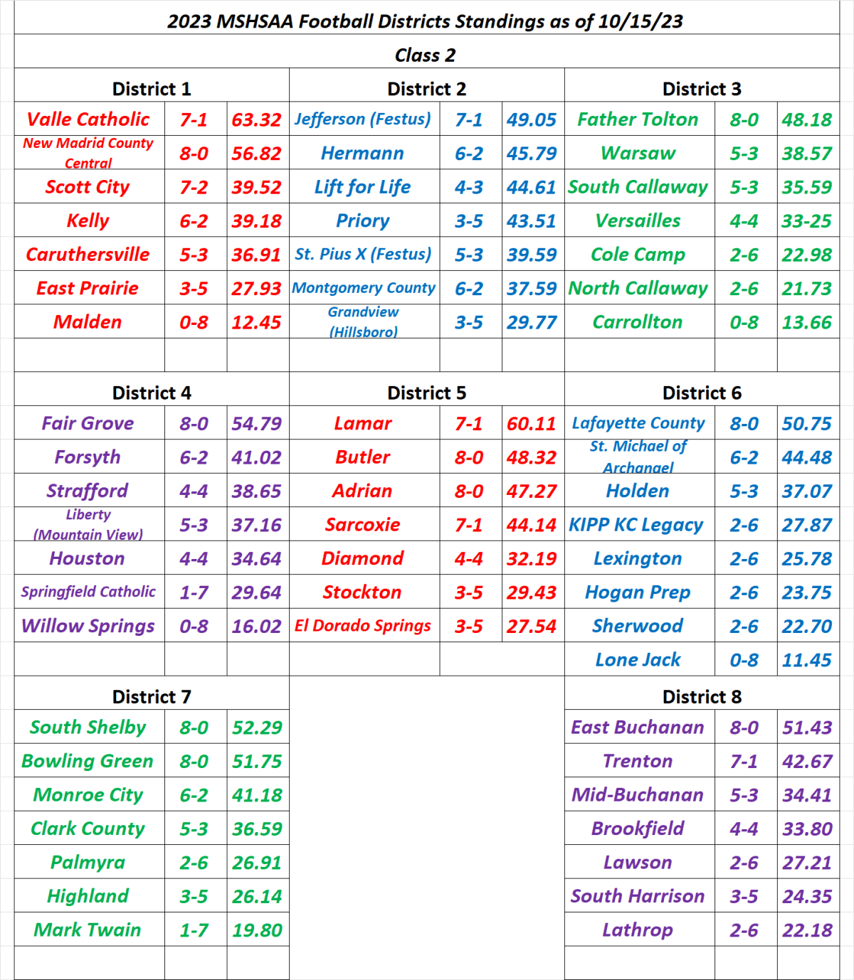 Stlprepsports.com 2023 MSHSAA Class 2 Football District Standings as of 10/15/23 Share this: Click to share on X (Opens in new window) X Click to share on Facebook (Opens in new window) Facebook Like Loading...