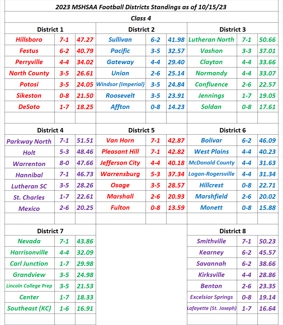 Stlprepsports.com 2023 MSHSAA Class 4 Football District Standings as of 10/15/23 Share this: Click to share on X (Opens in new window) X Click to share on Facebook (Opens in new window) Facebook Like Loading...