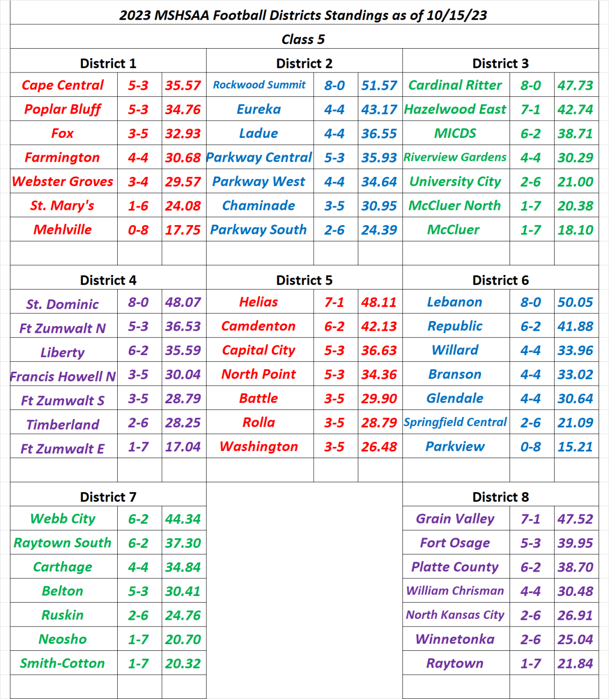 Stlprepsports.com 2023 MSHSAA Class 5 Football District Standings as of 10/15/23 Share this: Click to share on X (Opens in new window) X Click to share on Facebook (Opens in new window) Facebook Like Loading...