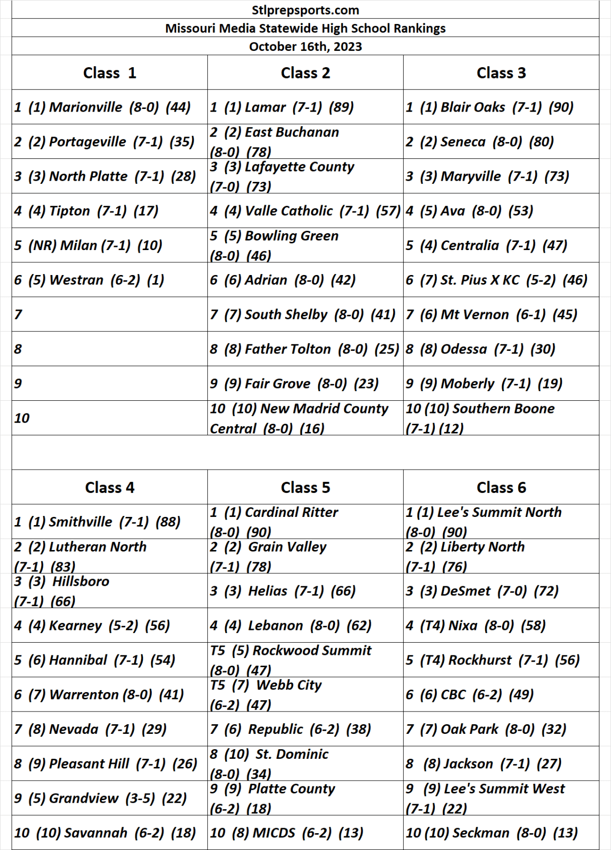 Stlprepsports.com Missouri Media High School Football Rankings 10/16/23 Share this: Click to share on X (Opens in new window) X Click to share on Facebook (Opens in new window) Facebook Like Loading...
