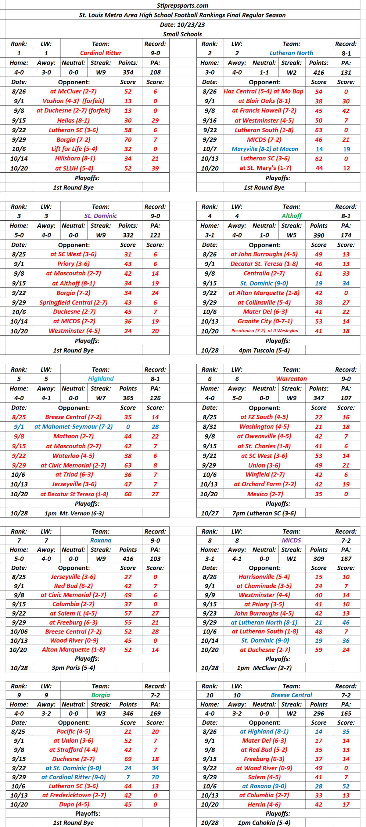 Stlprepsports.com 2023 St. Louis Metro Area High School Football Rankings Small Schools Final Regular Season Share this: Click to share on X (Opens in new window) X Click to share on Facebook (Opens in new window) Facebook Like Loading...
