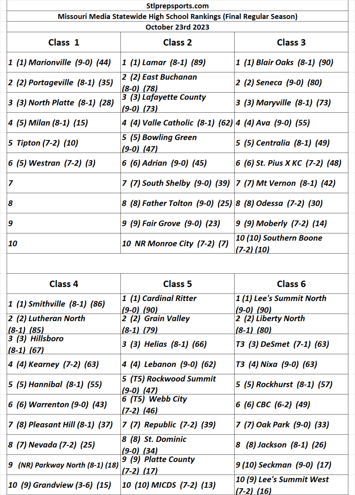 Stlprepsports.com Missouri Media High School Football Rankings (Final Regular Season)10/23/23 Share this: Click to share on X (Opens in new window) X Click to share on Facebook (Opens in new window) Facebook Like Loading...