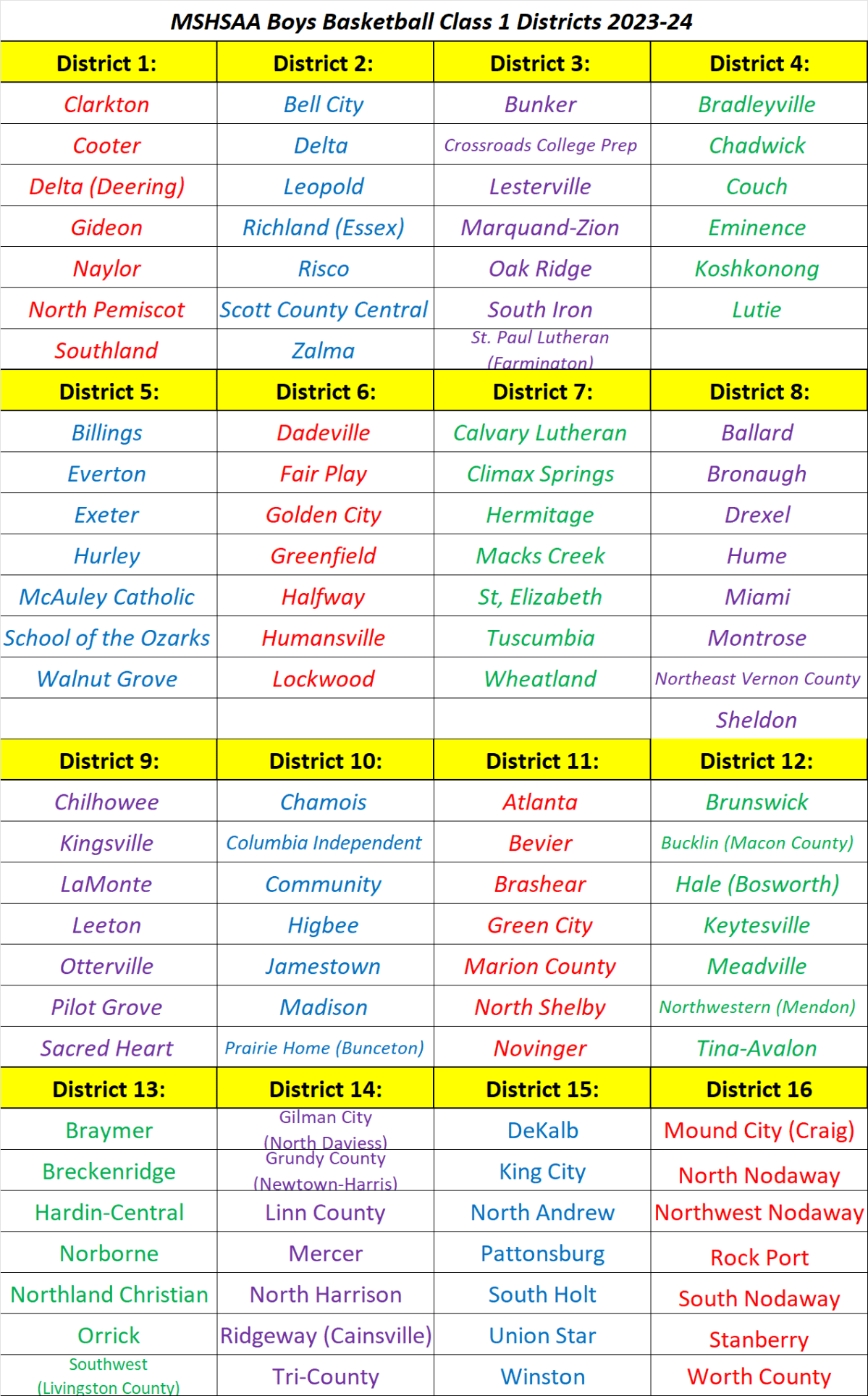 Stlprepsports.com 2023-24 MSHSAA Boys Basketball Class 1 Districts Share this: Click to share on X (Opens in new window) X Click to share on Facebook (Opens in new window) Facebook Like Loading...