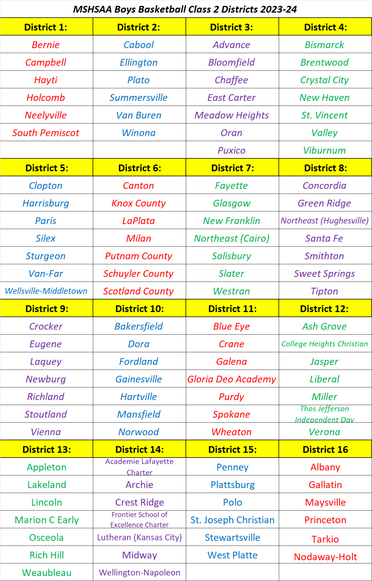 Stlprepsports.com 2023-24 MSHSAA Boys Basketball Class 2 Districts Share this: Click to share on X (Opens in new window) X Click to share on Facebook (Opens in new window) Facebook Like Loading...