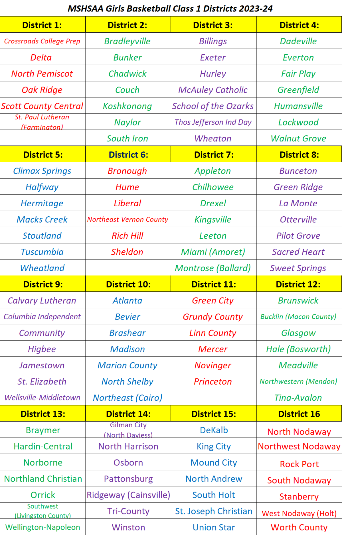 Stlprepsports.com 2023-24 MSHSAA Girls Basketball Class 1 Districts Share this: Click to share on X (Opens in new window) X Click to share on Facebook (Opens in new window) Facebook Like Loading...