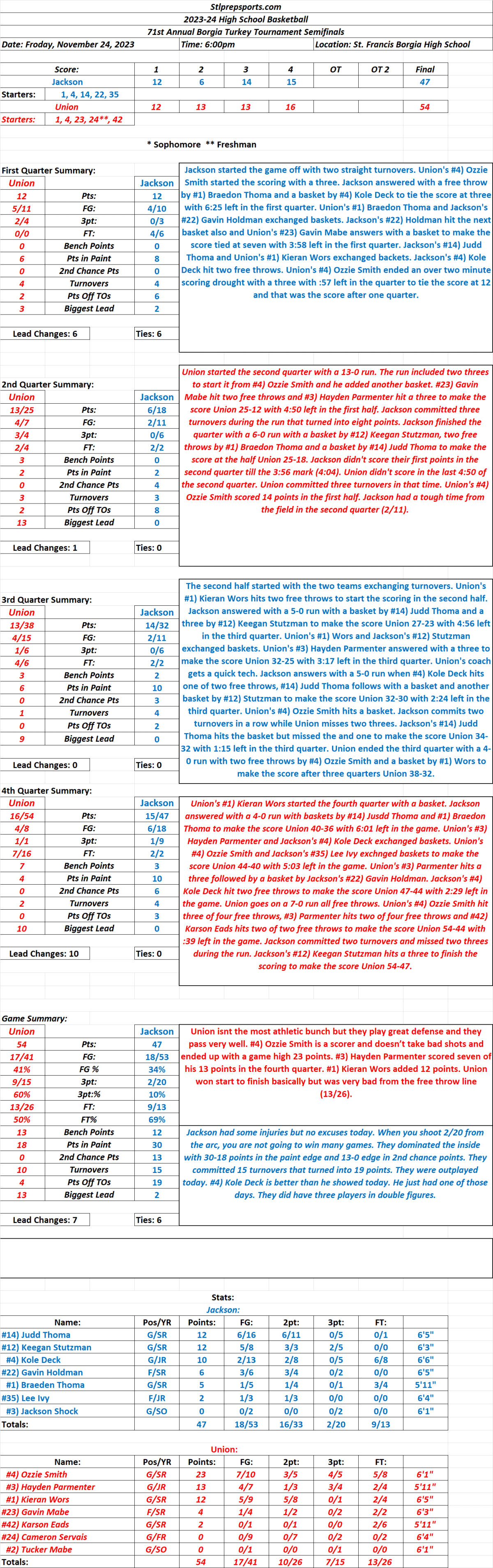Stlprepsports.com 11/24/23 71st Annual Borgia Turkey Tournament Semifinals: Union 54 Jackson 47 Final. The #5 Seed Union beats the #1 Seed Jackson 47. Union has a date with the host Borgia for the Championship Share this: Click to share on X (Opens in new window) X Click to share on Facebook (Opens in new window) Facebook Like Loading...