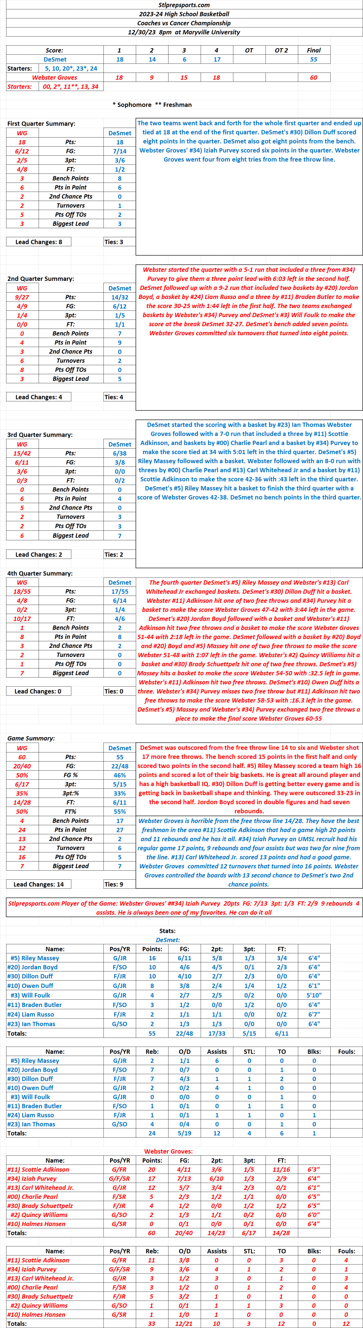 Stlprepsports.com 12/30/23 CVC Championship Desmet 55 vs Webster Groves 60 Final: Webster Groves wins the very good CVC Tourney Share this: Click to share on X (Opens in new window) X Click to share on Facebook (Opens in new window) Facebook Like Loading...