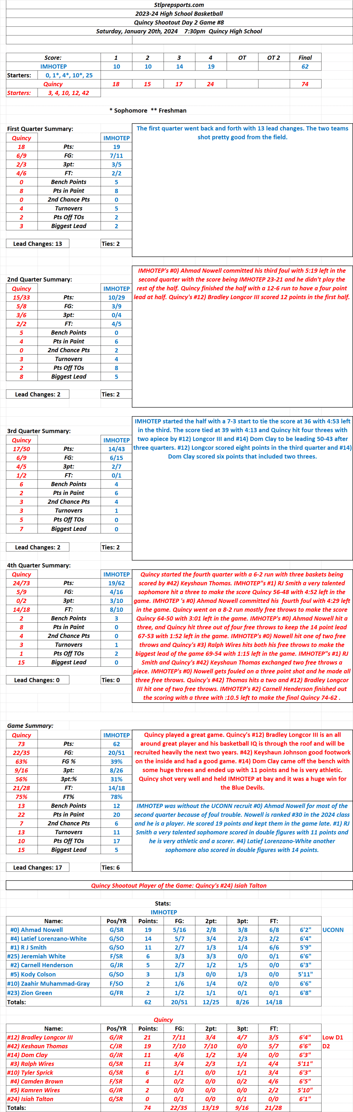 Stlprepsports.com Quincy Shootout 01/20/24 IMHOTEP 62 at Quincy 74 Final: Quincy shoots lights out from the field and three point arc to get a big win. Share this: Click to share on X (Opens in new window) X Click to share on Facebook (Opens in new window) Facebook Like Loading...
