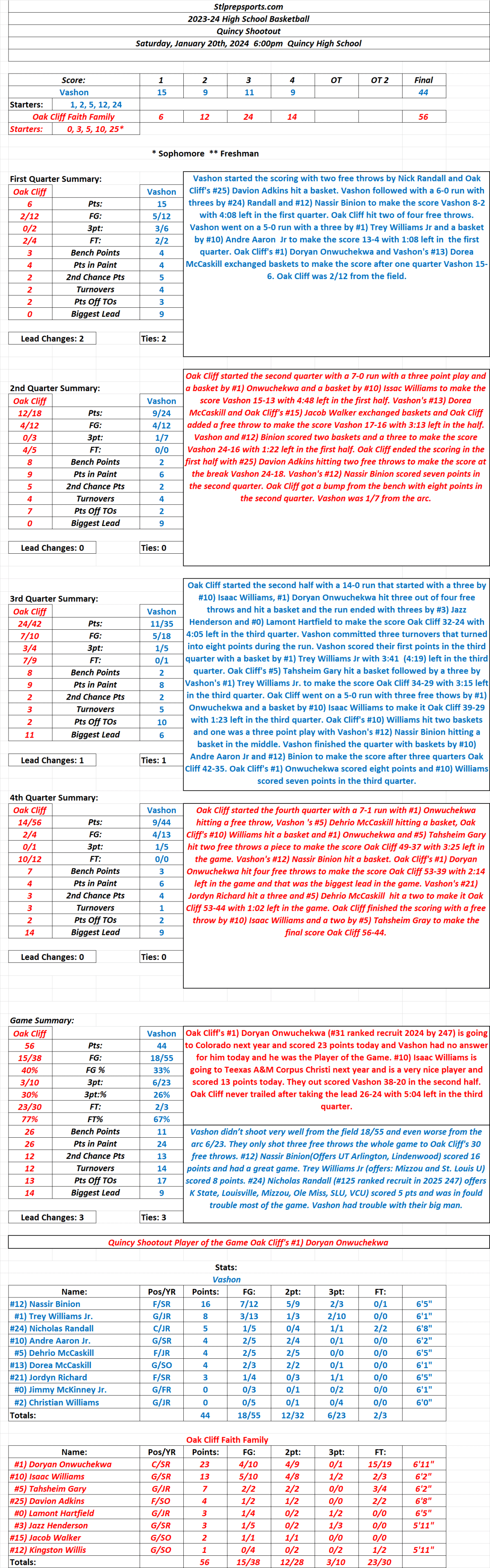 Stlprepsports.com Quincy Shootout at QHS 1/20/24 Vashon 44 Oak Cliff Faith Family 56 Final: Oak Cliff took over in the second half and outscored Vashon 38-20 in the 2nd half Share this: Click to share on X (Opens in new window) X Click to share on Facebook (Opens in new window) Facebook Like Loading...