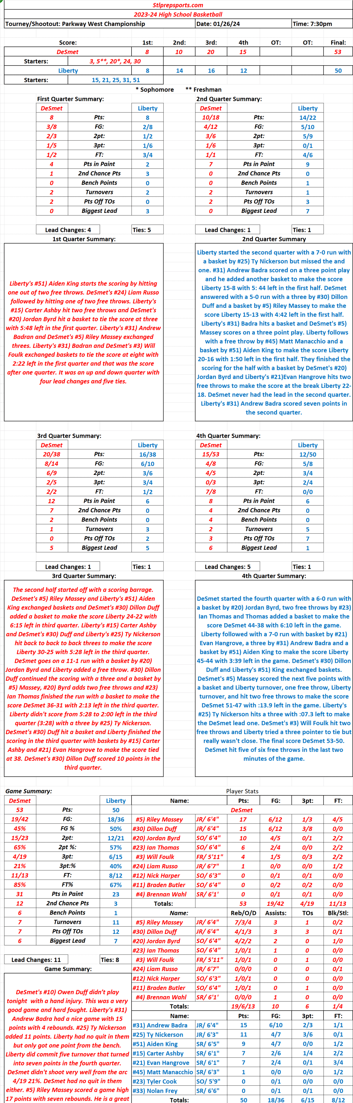 Stlprepsports.com 2024 Parkway West Championship 01/26/24 DeSmet 53 Liberty 50 Final: DeSmet won a hard fought battle for the title. Share this: Click to share on X (Opens in new window) X Click to share on Facebook (Opens in new window) Facebook Like Loading...