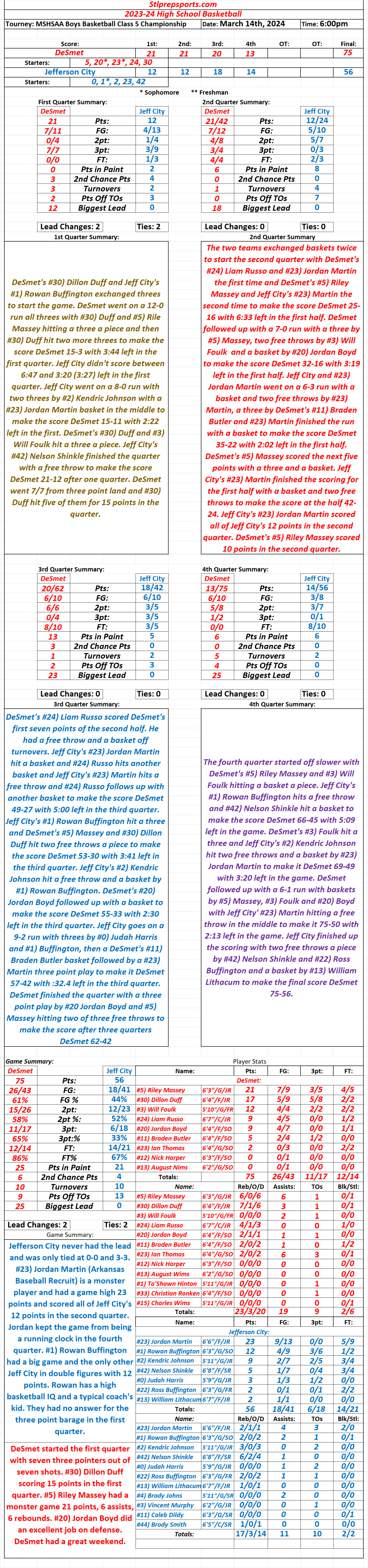 Stlprepsports.com MSHSAA Boys Basketball Class 5 State Championship DeSmet 75 Jefferson City 56 Final Share this: Click to share on X (Opens in new window) X Click to share on Facebook (Opens in new window) Facebook Like Loading...