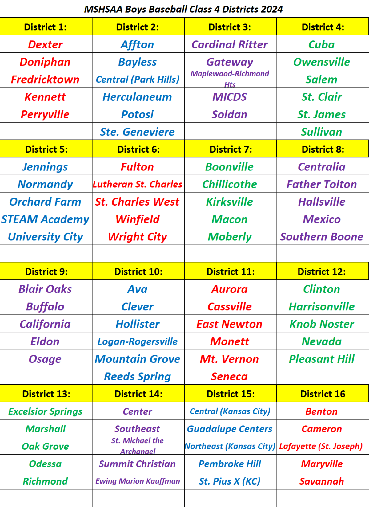 Stlprepsports.com 2024 MSHSAA Spring Baseball Districts Class 4 Share this: Click to share on X (Opens in new window) X Click to share on Facebook (Opens in new window) Facebook Like Loading...