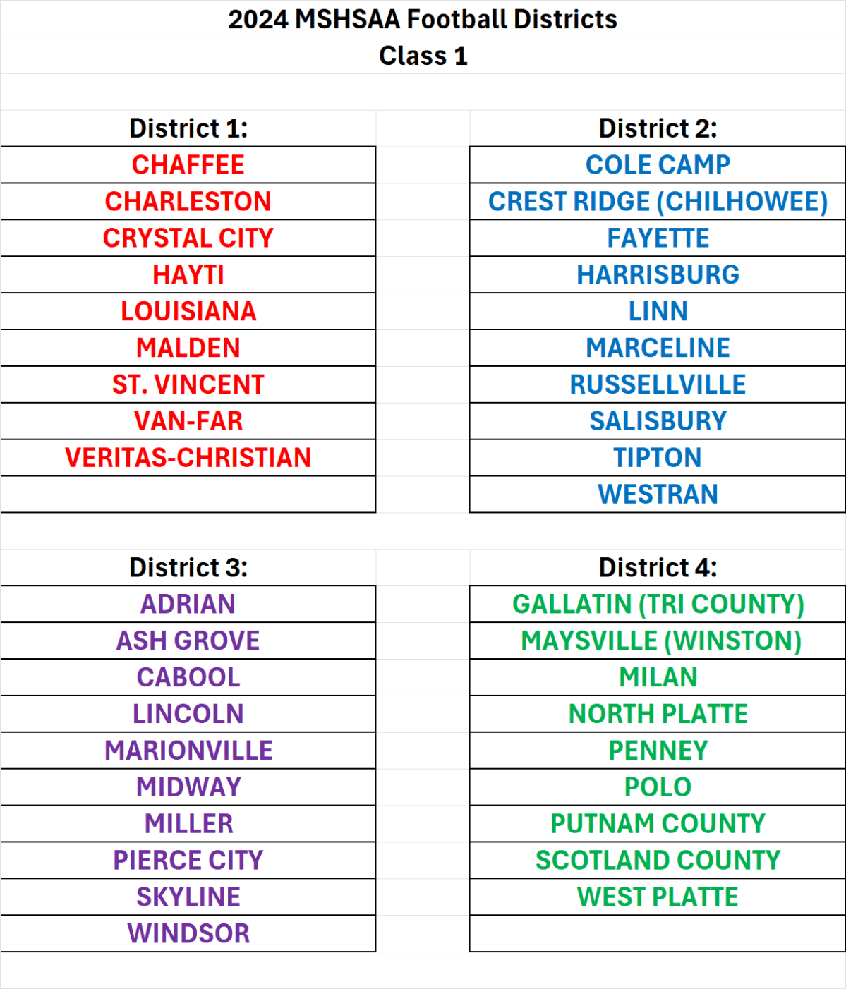 Stlprepsports.com 2024 MSHSAA Class 1 Football Districts Share this: Click to share on X (Opens in new window) X Click to share on Facebook (Opens in new window) Facebook Like Loading...