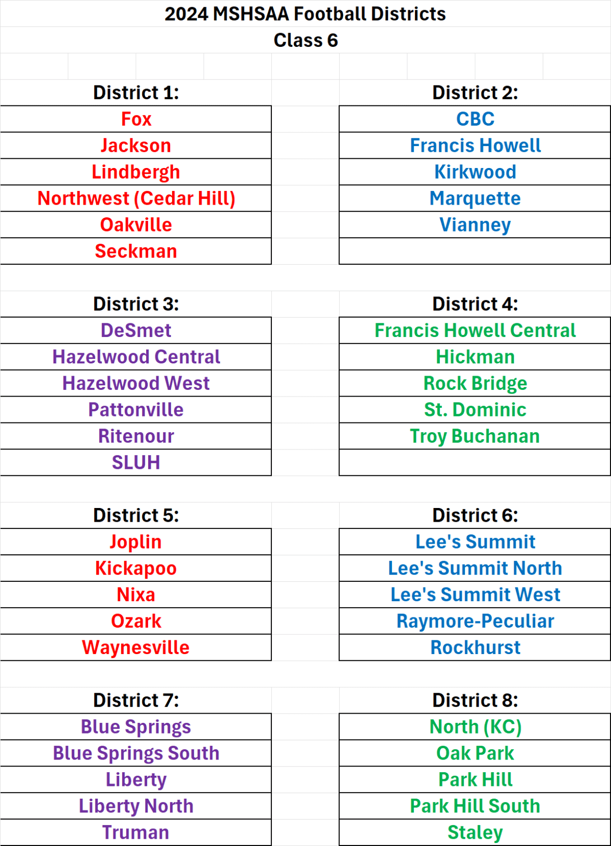 Stlprepsports.com 2024 MSHSAA Class 6 Football Districts Share this: Click to share on X (Opens in new window) X Click to share on Facebook (Opens in new window) Facebook Like Loading...