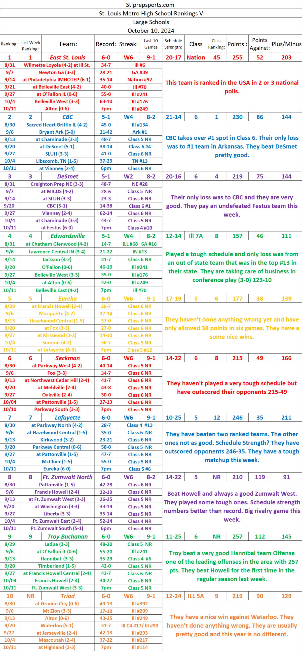 Stlprepsports.com’s St. Louis Metro High School Football Rankings V Large Schools 10/10/24 Share this: Click to share on X (Opens in new window) X Click to share on Facebook (Opens in new window) Facebook Like Loading...