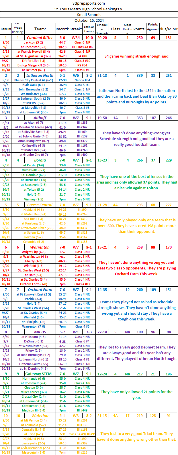 Stlprepsports.com’s St. Louis Metro High School Football Rankings VI Small Schools 10/16/24 Share this: Click to share on X (Opens in new window) X Click to share on Facebook (Opens in new window) Facebook Like Loading...
