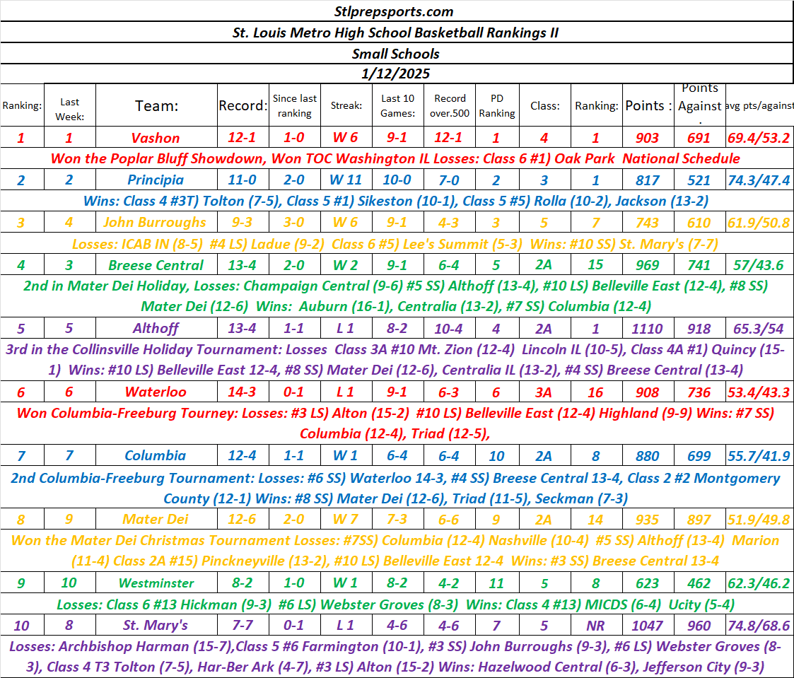 Stlprepsports.com’s 2024-25 St. Louis Metro High School Rankings II (Small Schools) 1/13/25 Share this: Click to share on X (Opens in new window) X Click to share on Facebook (Opens in new window) Facebook Like Loading...