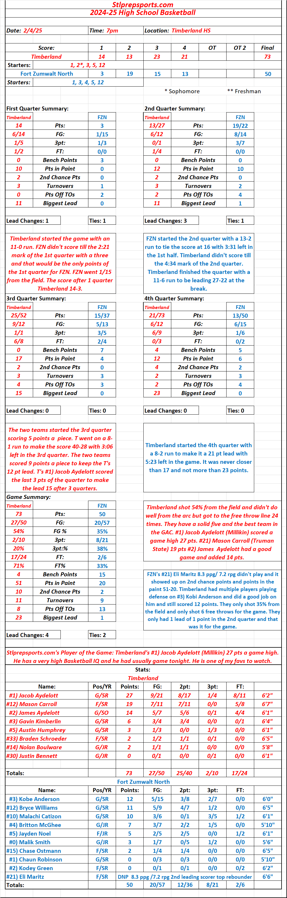 Stlprepsports.com: HSBB 2/4/25 GAC Basketball Fort Zumwalt North 50 at Timberland 73 Final: Timberland with a decisive win to make its record 17-1. Share this: Click to share on X (Opens in new window) X Click to share on Facebook (Opens in new window) Facebook Like Loading...