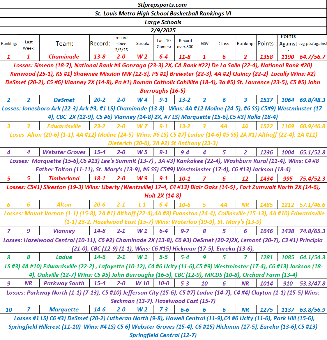 Stlprepsports.com’s 2024-25 St. Louis Metro High School Rankings VI (Large Schools) 2/10/25 Share this: Click to share on X (Opens in new window) X Click to share on Facebook (Opens in new window) Facebook Like Loading...