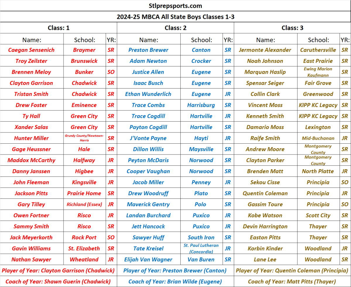 Stlprepsports.com: MBCA Boys All-State Teams Classes 1-3 Share this: Click to share on X (Opens in new window) X Click to share on Facebook (Opens in new window) Facebook Like Loading...