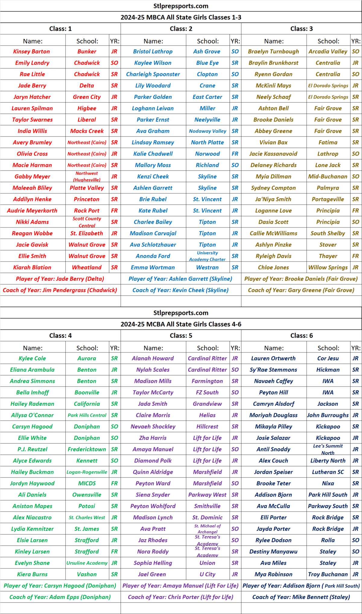 Stlprepsports.com: MBCA Girls All-State Teams Classes 1-6 Share this: Click to share on X (Opens in new window) X Click to share on Facebook (Opens in new window) Facebook Like Loading...