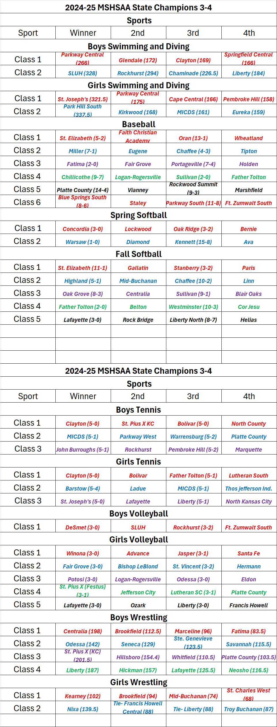 Stlprepsports.com 2024-25 MSHSAA State Champions 3-4 Share this: Click to share on X (Opens in new window) X Click to share on Facebook (Opens in new window) Facebook Like Loading...