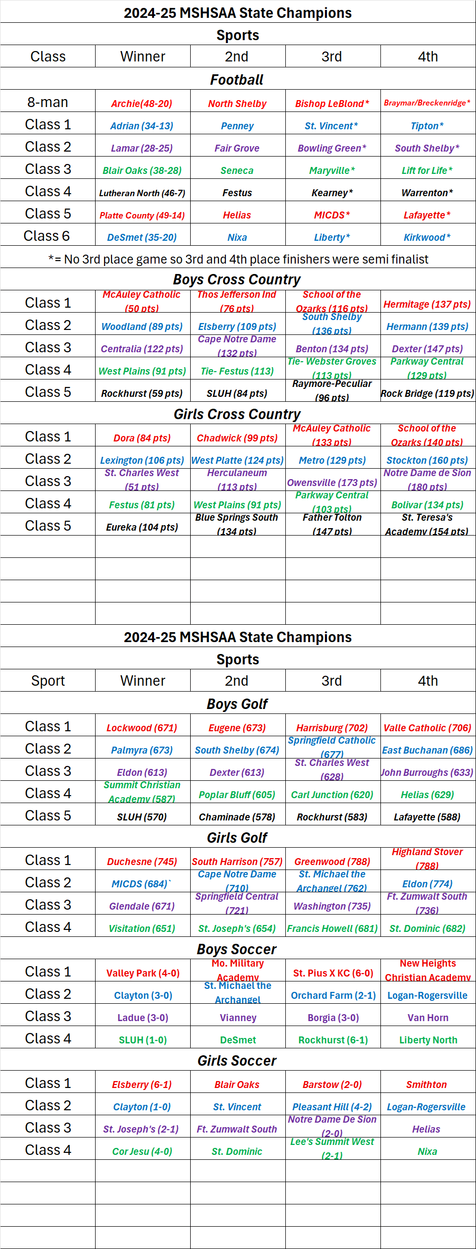 Stlprepsports.com 2024-25 MSHSAA State Champions Page 1-2 Share this: Click to share on X (Opens in new window) X Click to share on Facebook (Opens in new window) Facebook Like Loading...