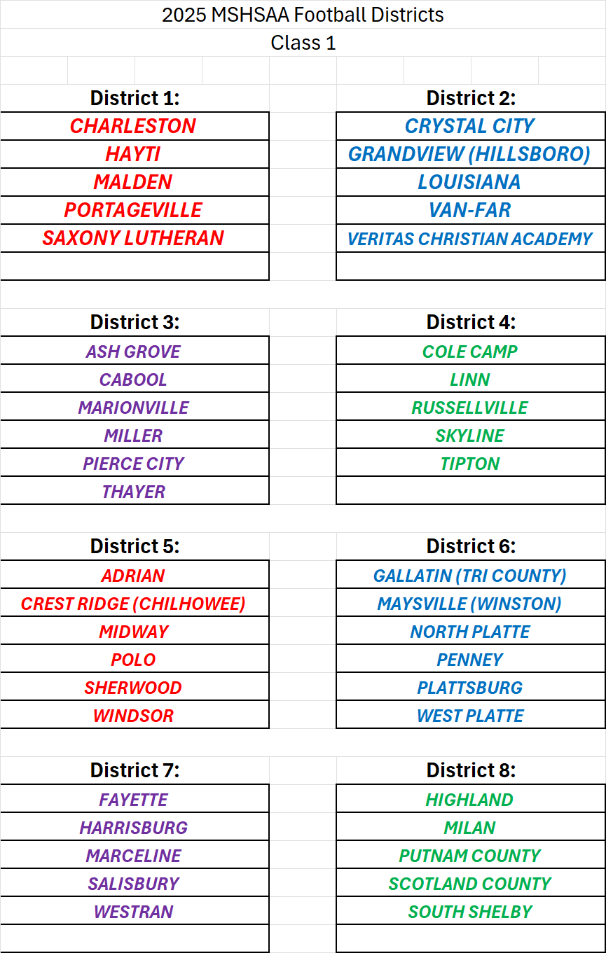 Stlprepsports.com 2025 MSHSAA Football Class 1 Districts Share this: Click to share on X (Opens in new window) X Click to share on Facebook (Opens in new window) Facebook Like Loading...