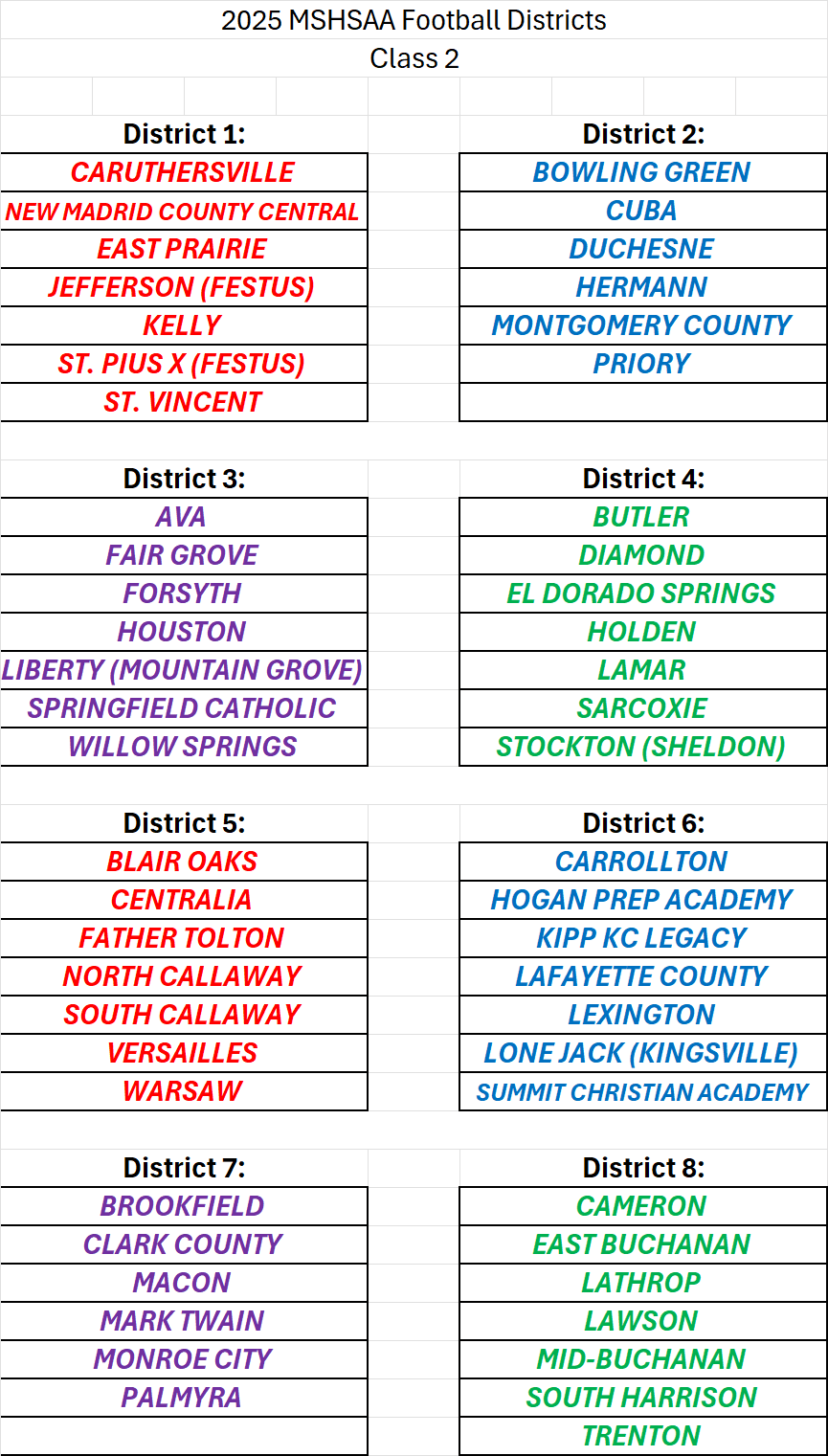 Stlprepsports.com 2025 MSHSAA Football Class 2 Districts Share this: Click to share on X (Opens in new window) X Click to share on Facebook (Opens in new window) Facebook Like Loading...