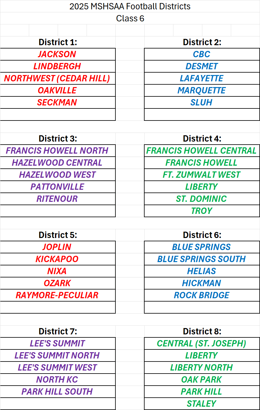 Stlprepsports.com 2025 MSHSAA Football Class 6 Districts Share this: Click to share on X (Opens in new window) X Click to share on Facebook (Opens in new window) Facebook Like Loading...