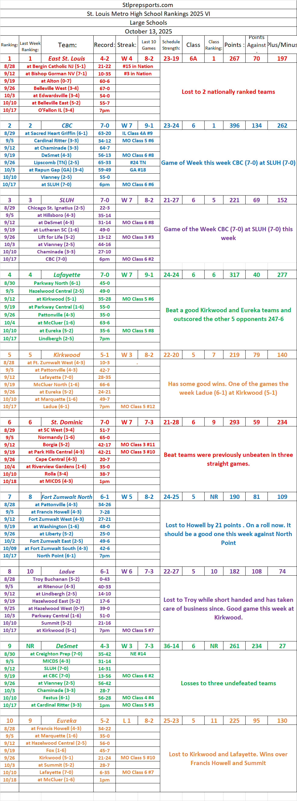 Stlprepsports.com 2025 St. Louis Metro Area Large School Football Rankings VI 10/14/25 Share this: Click to share on X (Opens in new window) X Click to share on Facebook (Opens in new window) Facebook Like Loading...