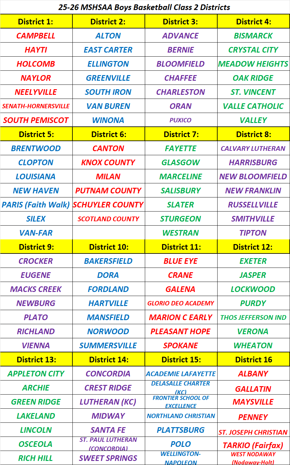 Stlprepsports.com 2025-26 MSHSAA Boys Basketball Class 2 Districts Share this: Click to share on X (Opens in new window) X Click to share on Facebook (Opens in new window) Facebook Like Loading...