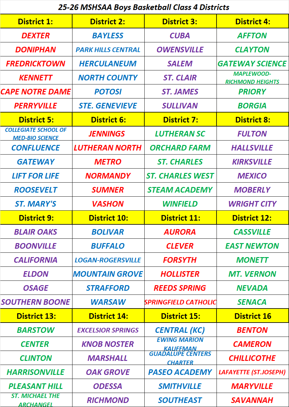 Stlprepsports.com 2025-26 MSHSAA Boys Basketball Class 4 Districts Share this: Click to share on X (Opens in new window) X Click to share on Facebook (Opens in new window) Facebook Like Loading...