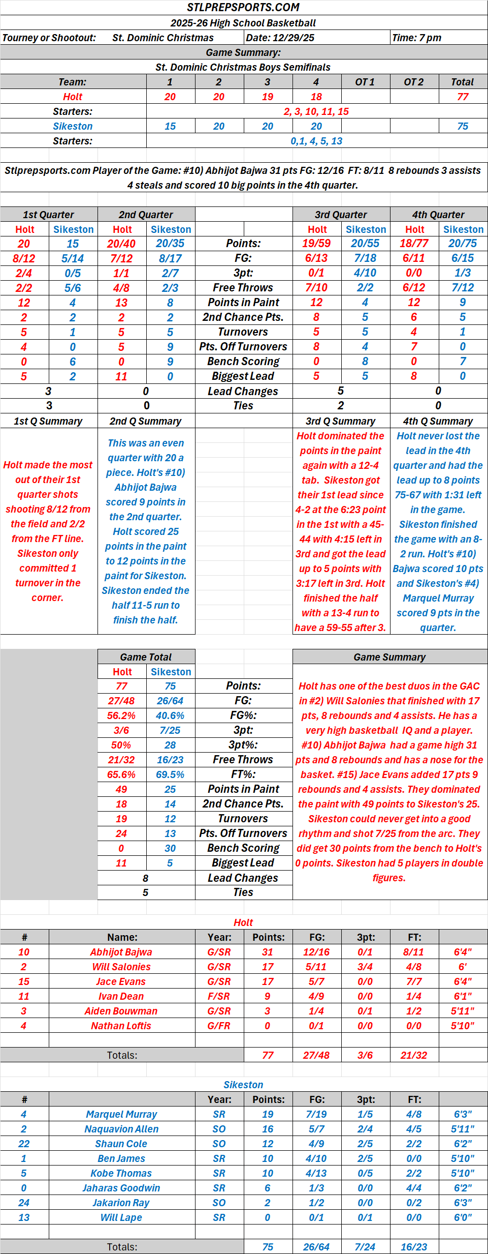 Stlprepsports.com: 12-29-25 St. Dominic Christmas Tournament Boys Semifinals Holt 77 Sikeston 75 Final: Holt’s great duo Salonies and Bajwa scored 48 points for the big upset. Share this: Click to share on X (Opens in new window) X Click to share on Facebook (Opens in new window) Facebook Like Loading...