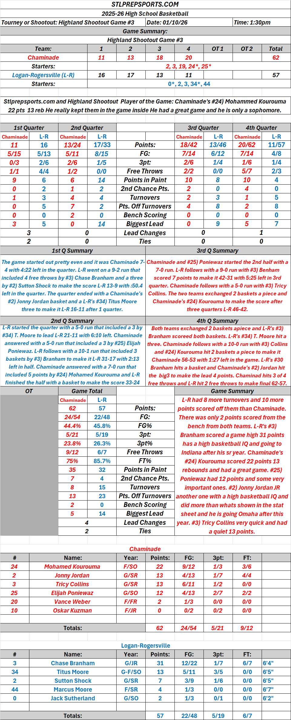 Stlprepsports.com 01-10-26 Highland Shootout Game #3: Chaminade 62 Logan-Rogersville 57 Final: Chaminade comes back from 14 point deficit and #24) Mohamed Kourouma has a comeout game with 22 points 13 rebounds. Share this: Click to share on X (Opens in new window) X Click to share on Facebook (Opens in new window) Facebook Like Loading...