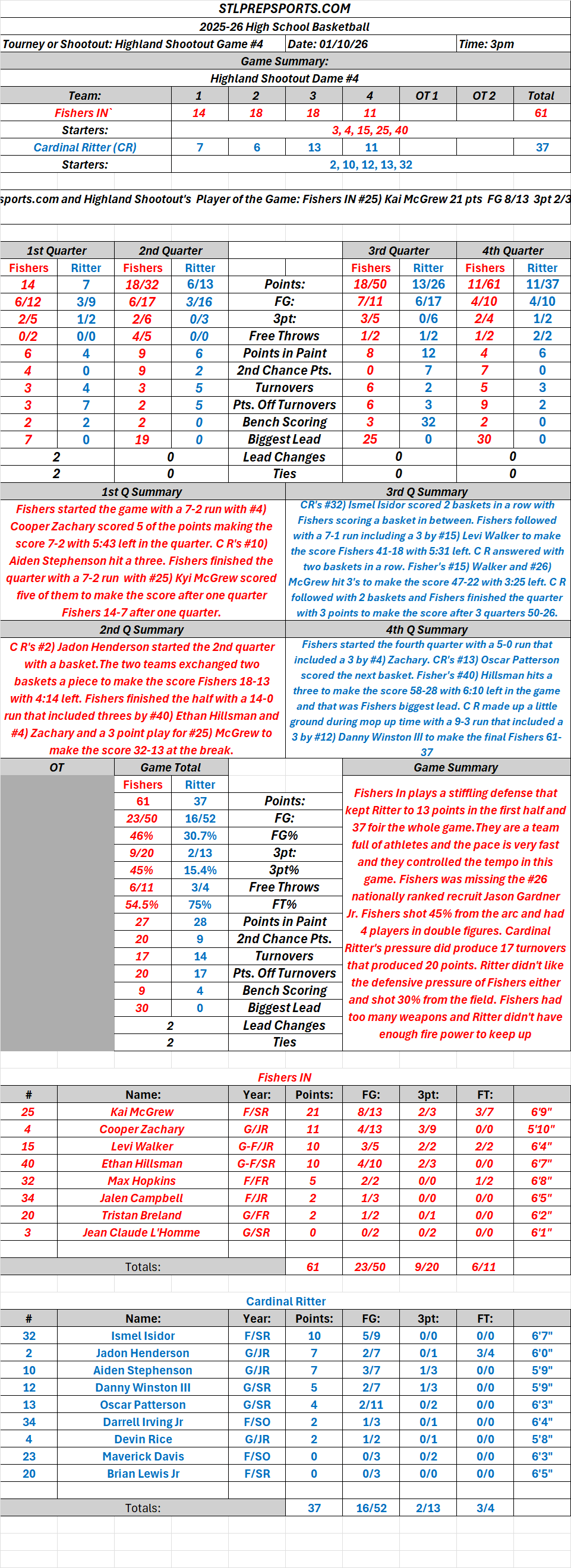 Stlprepsports.com: 01-10-26 Highland Shootout Game #4) Fishers IN 61 Cardinal Ritter 37 Final Nationally Ranked Fishers IN won start to finish with stifling defense Share this: Click to share on X (Opens in new window) X Click to share on Facebook (Opens in new window) Facebook Like Loading...