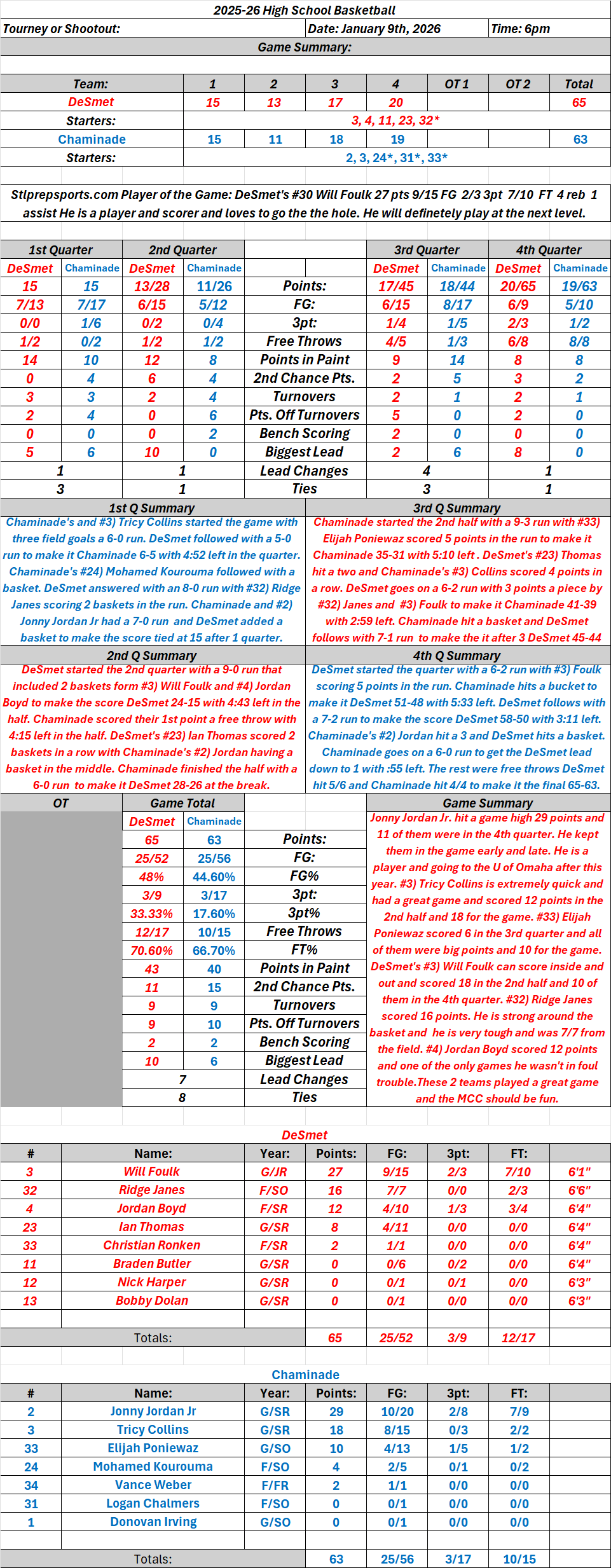 Stlprepsports.com: 01-09-26 MCC DeSmet 65 at Chaminade 63 Final: Chaminade’s #2) Jonny Jordan Jr (29) and DeSmet’s #3) Will Foulk (27) went at it in this one. Share this: Share on X (Opens in new window) X Share on Facebook (Opens in new window) Facebook Like Loading...