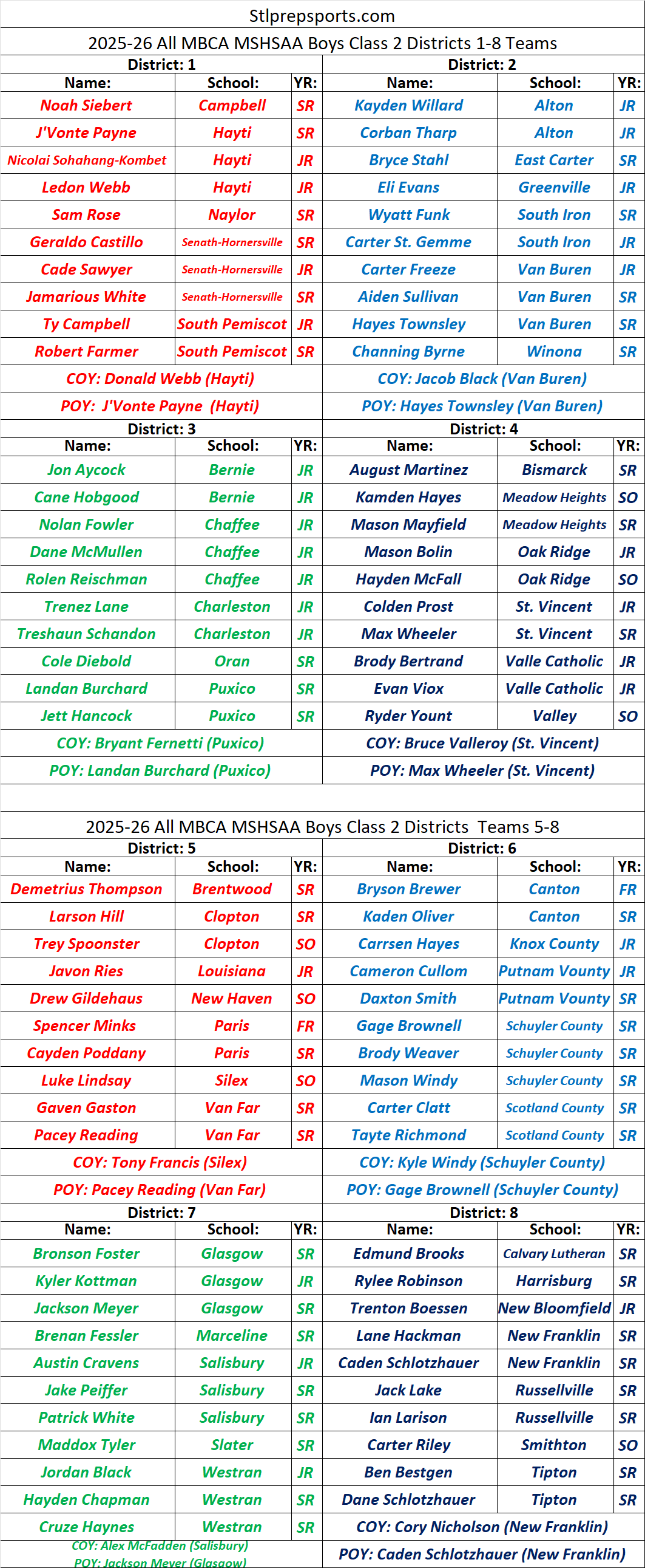 Stlprepsports.com: 25-26 MBCA Boys Class 2 All-District Teams 1-8 Share this: Share on X (Opens in new window) X Share on Facebook (Opens in new window) Facebook Like Loading...