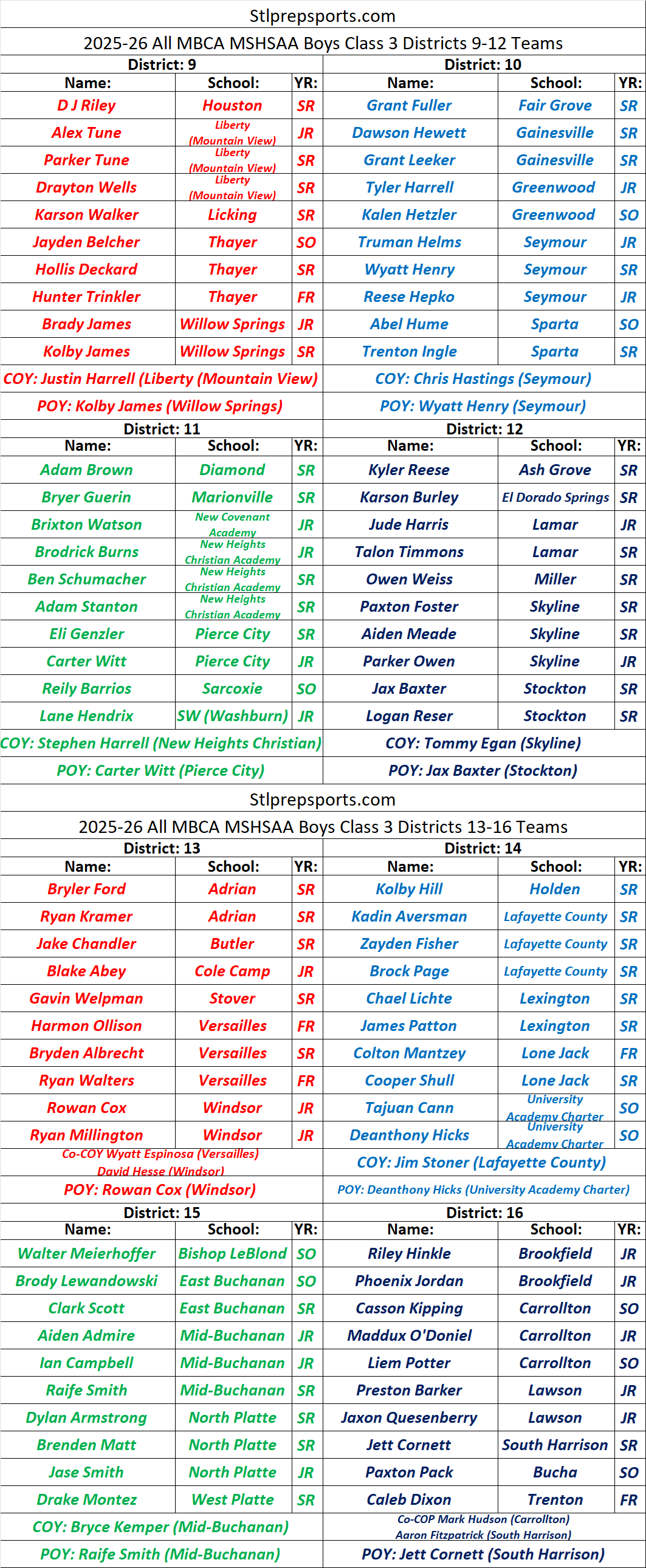 Stlprepsports.com: 25-26 MBCA Boys Class 3 All-District Teams 9-16 Share this: Share on X (Opens in new window) X Share on Facebook (Opens in new window) Facebook Like Loading...