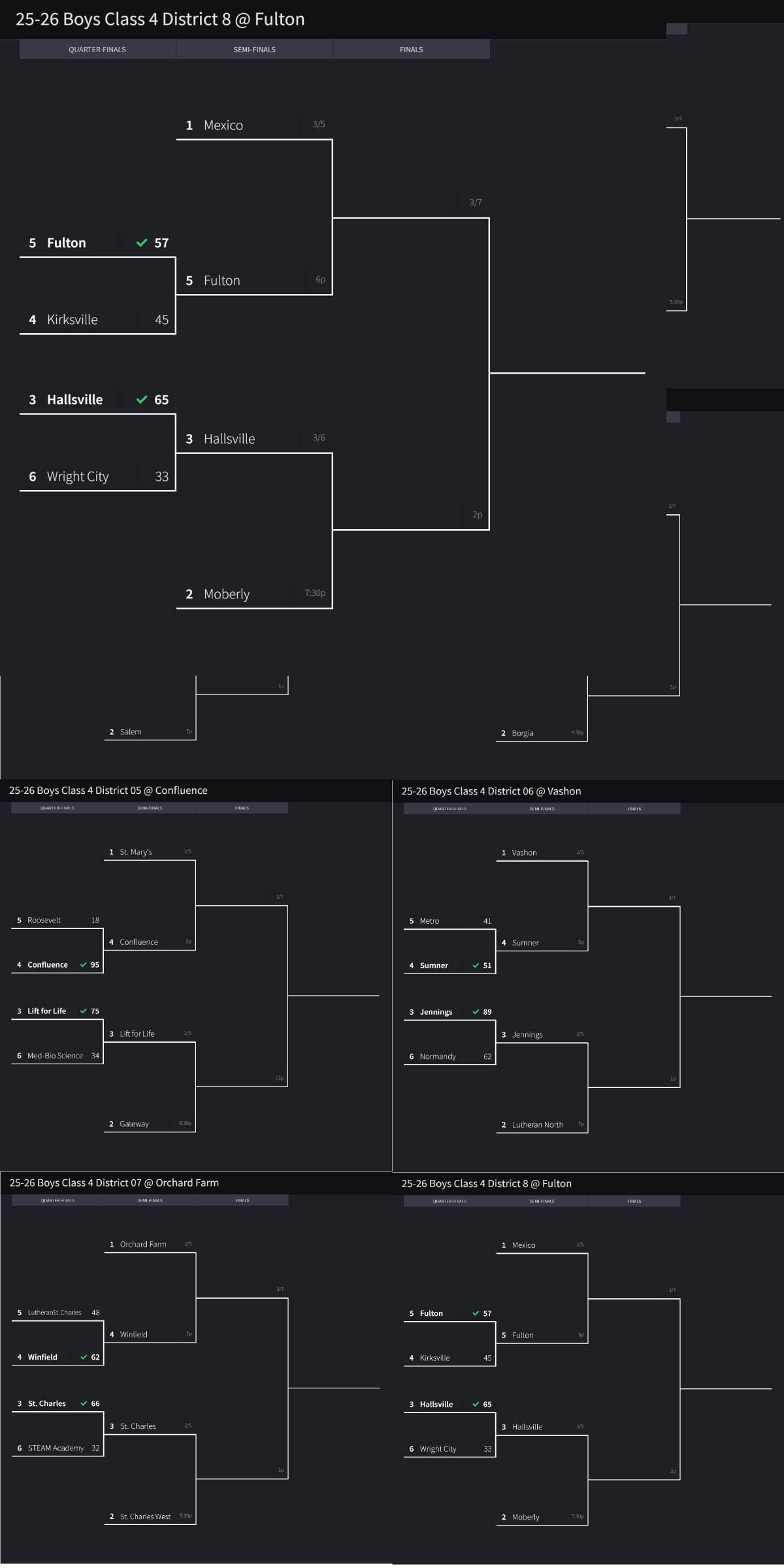Stlprepsports.com 2025-26 MSHSAA Boys Basketball Class 4 Districts 1-8 Semifinals Share this: Share on X (Opens in new window) X Share on Facebook (Opens in new window) Facebook Like Loading...